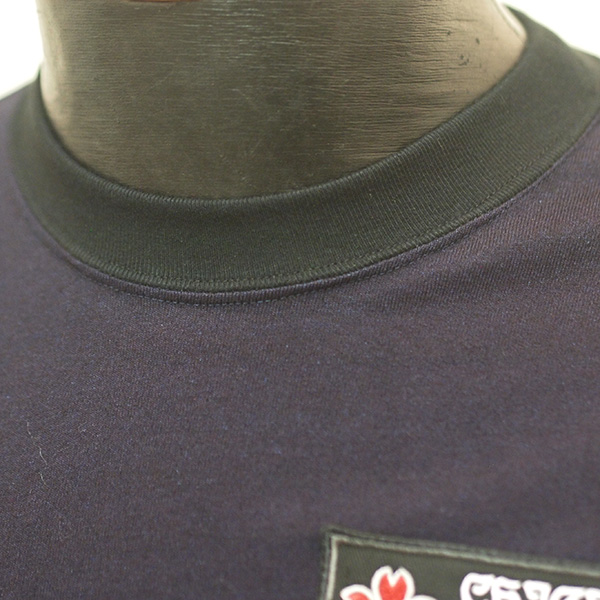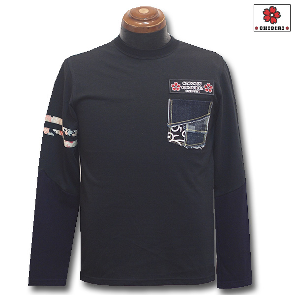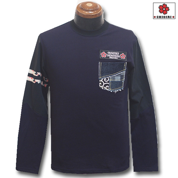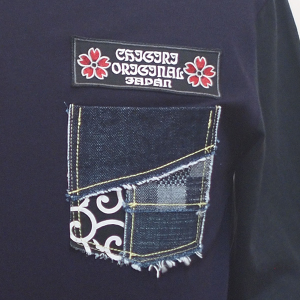 また、胸ポケットは4種類の生地をパッチワークに仕立てたこだわりのポケット。その上にはCHIGIRIの刺繍ワッペンを施しました。