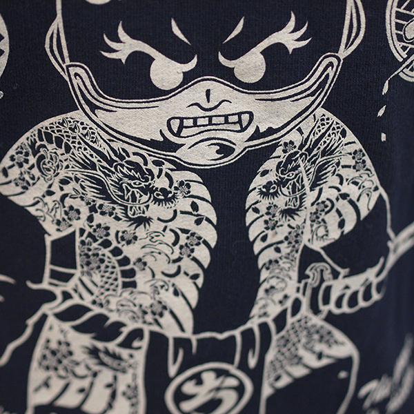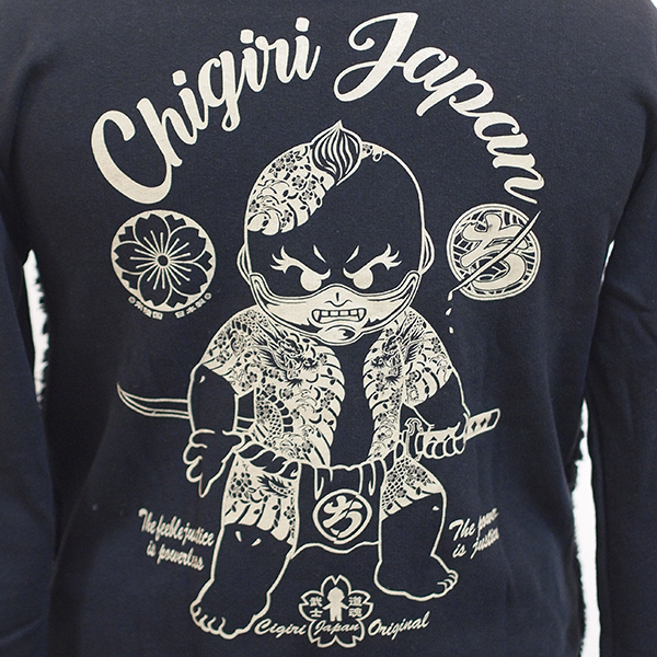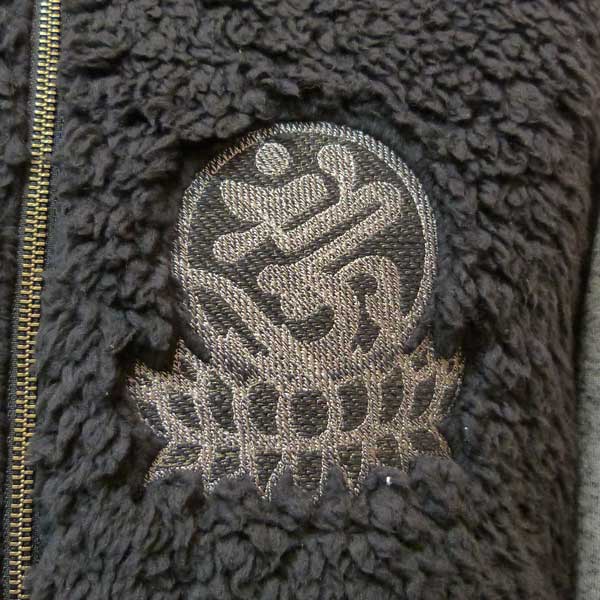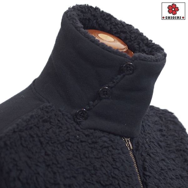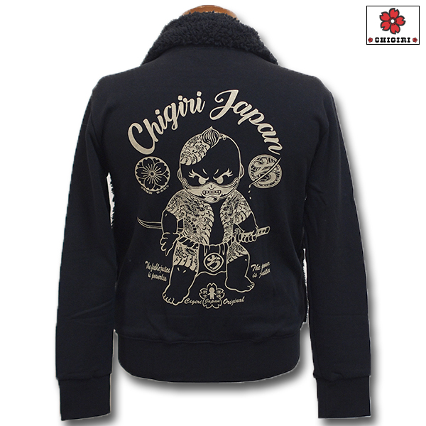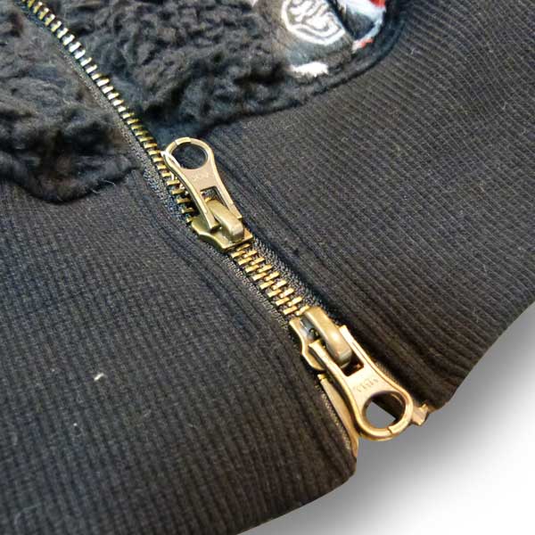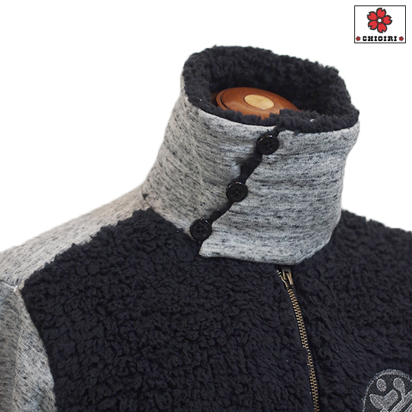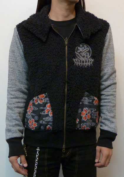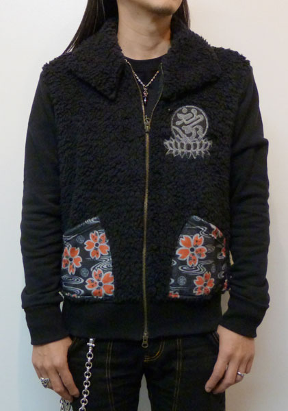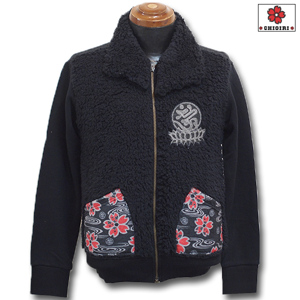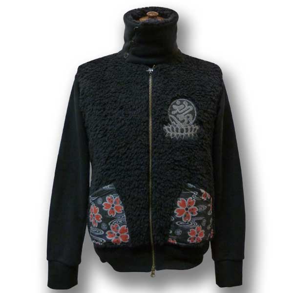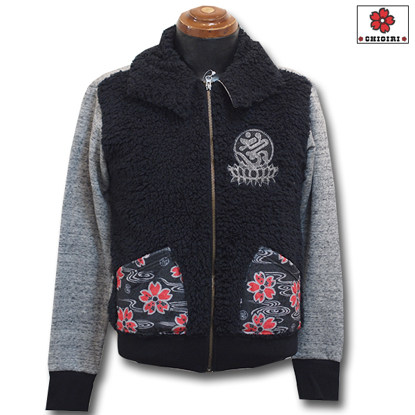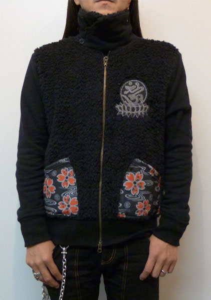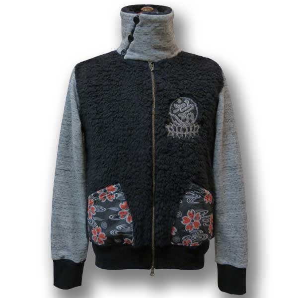 前身頃にはボア生地を配したジップスウェット。ポケットは桜流水柄のオリジナルボア生地で、サクラの赤がアクセントになっています。