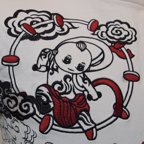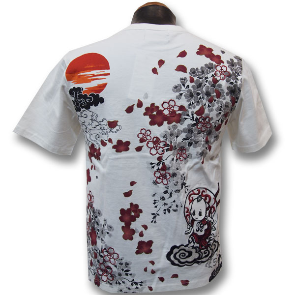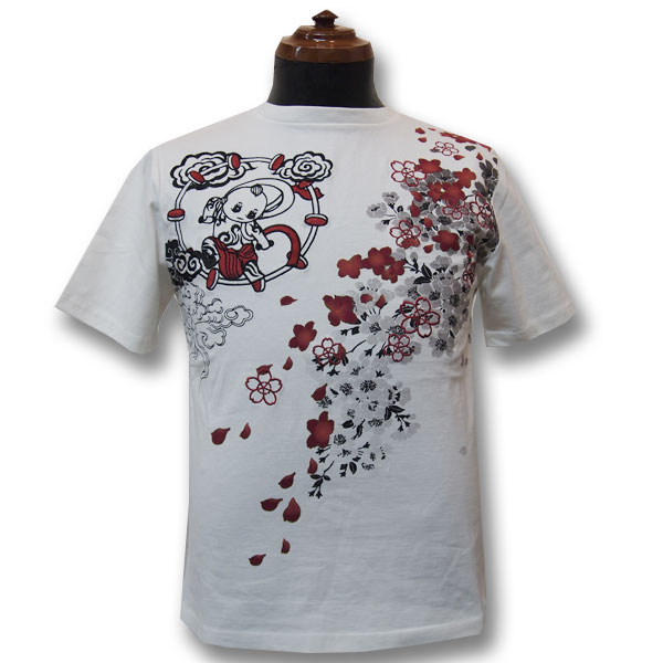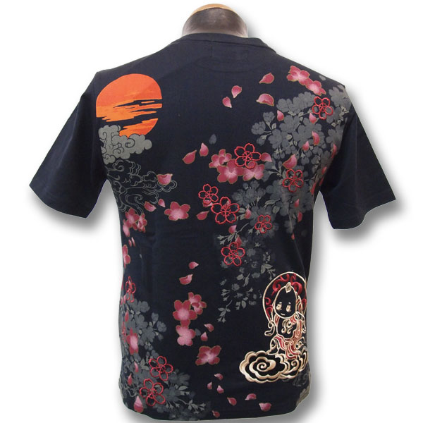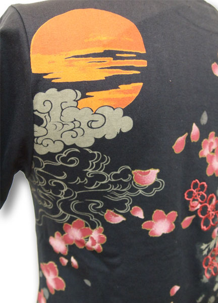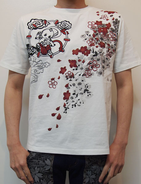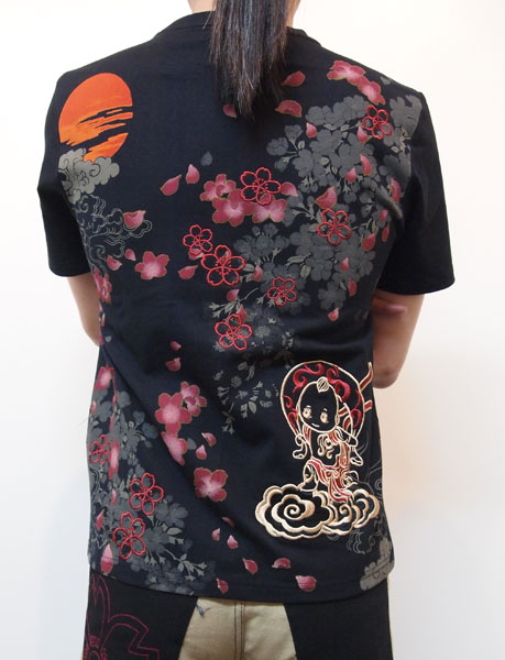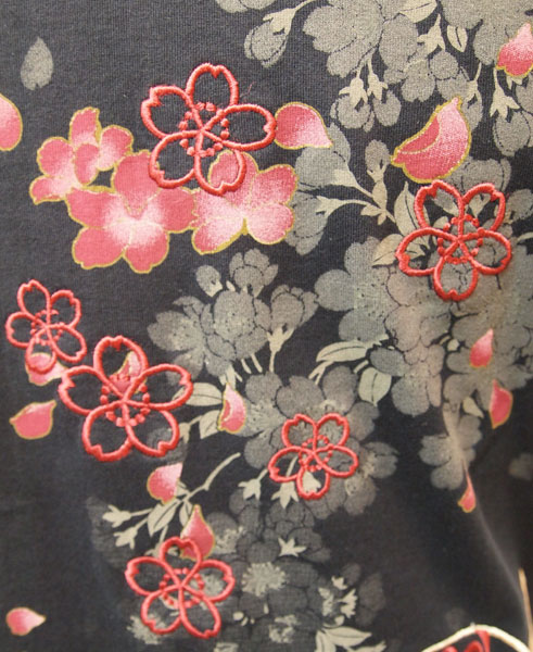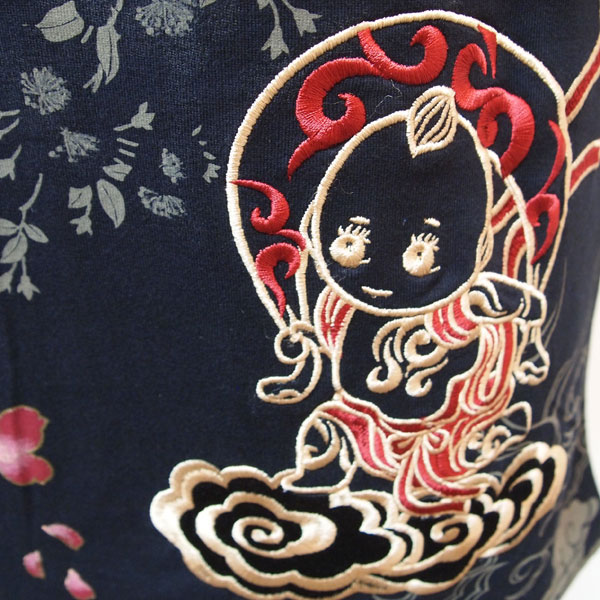 風神雷神、桜の赤い花部分は刺繍、その他はプリントになります。