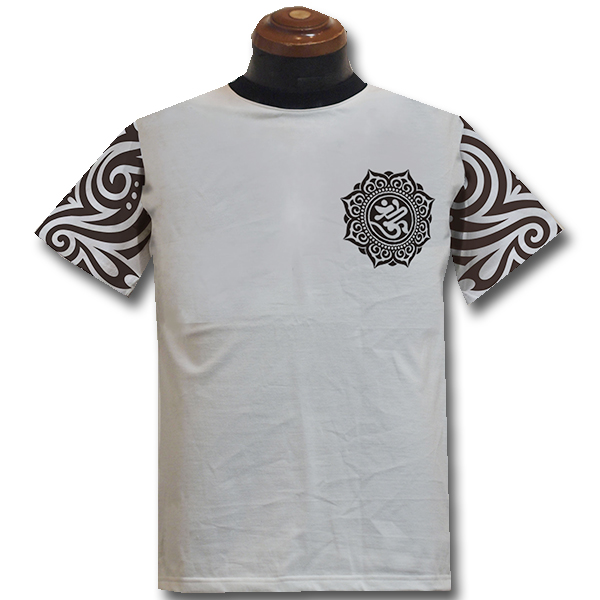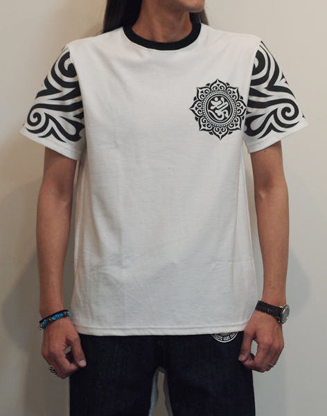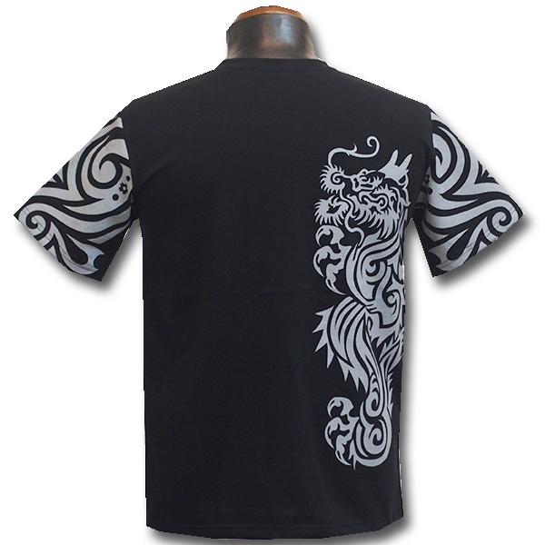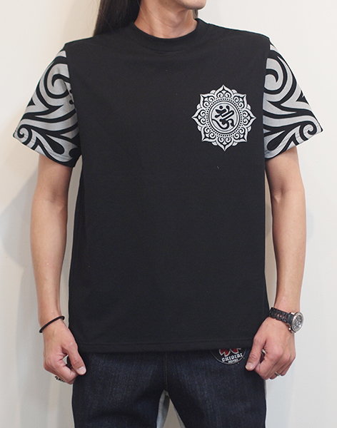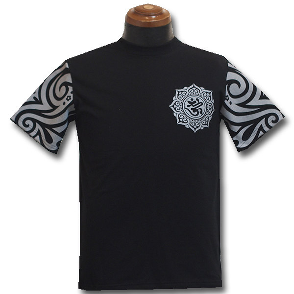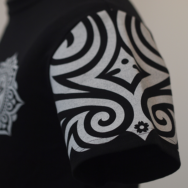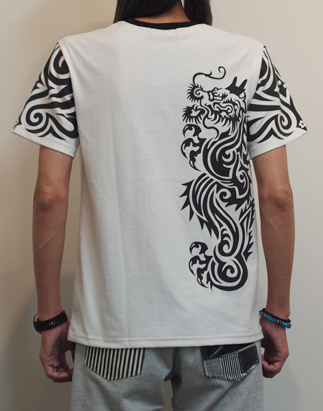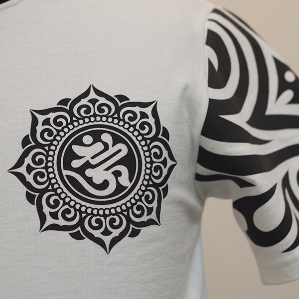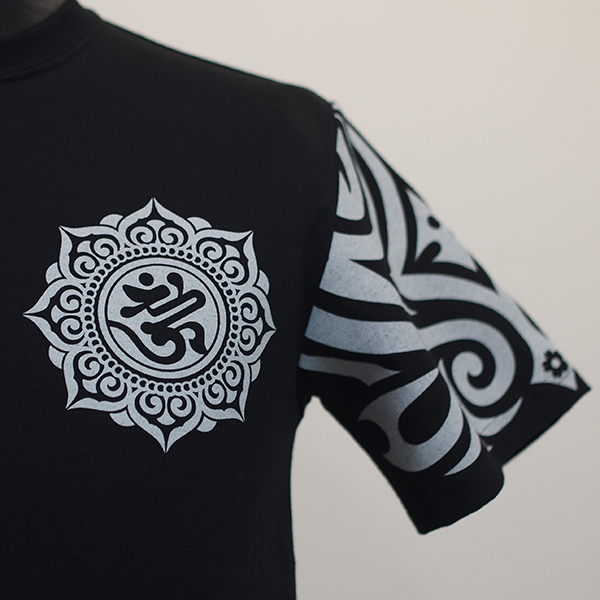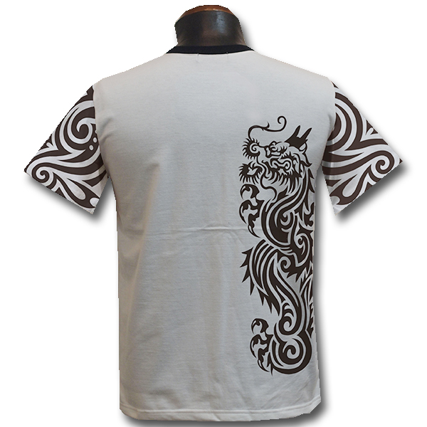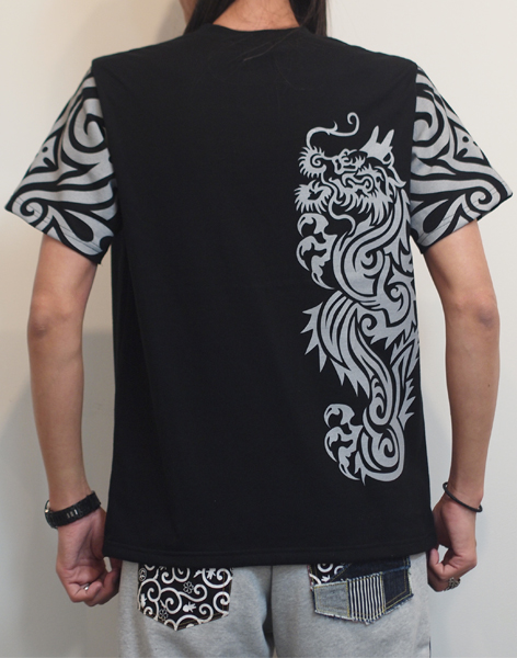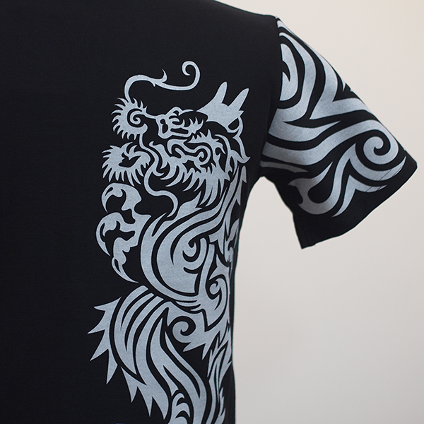 フロントは梵字プリント、バックにはドラゴンをトライバルで表現したデザインをプリントしました。