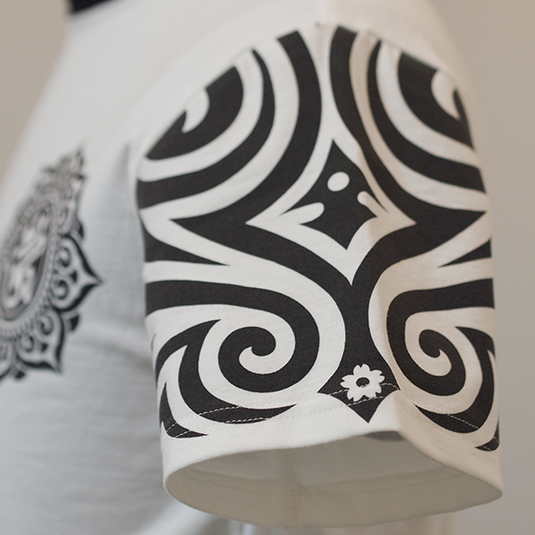 袖はトライバル柄のプリント。CHIGIRIらしく、所々に桜が隠れています。