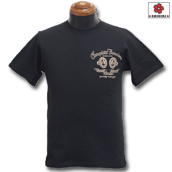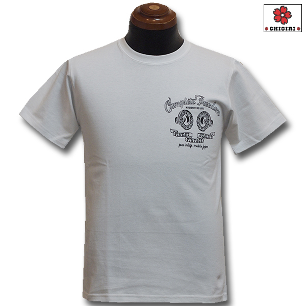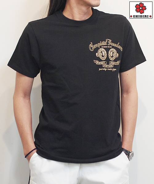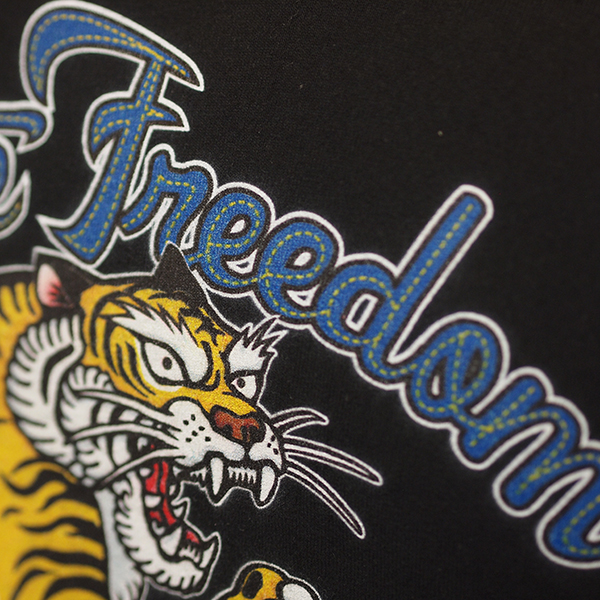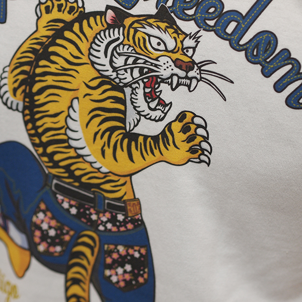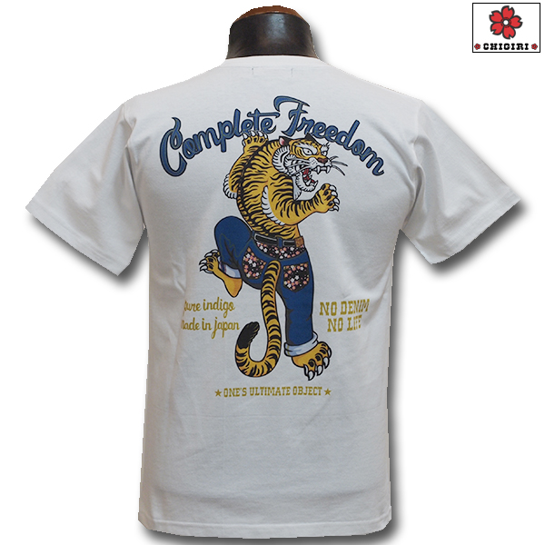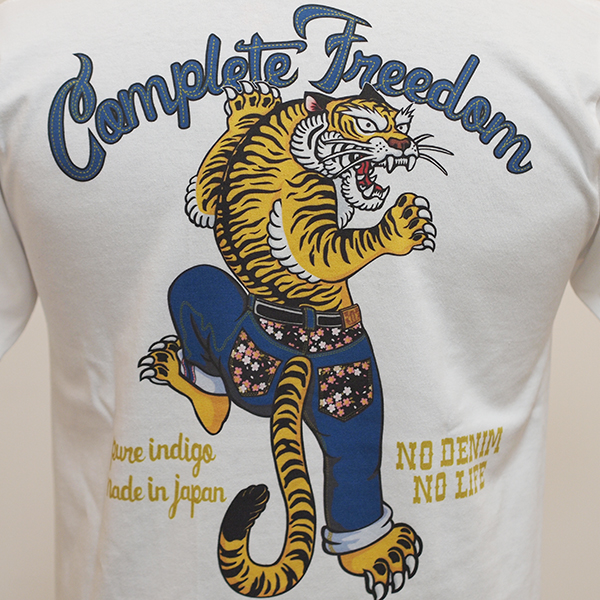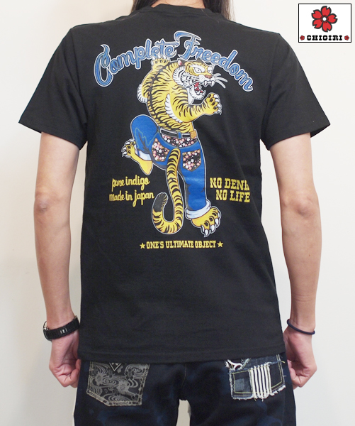 CHIGIRIの桜金襴デニムを履いたトラがバックにプリントされたTシャツ。