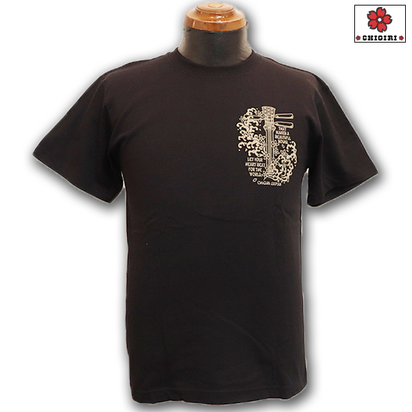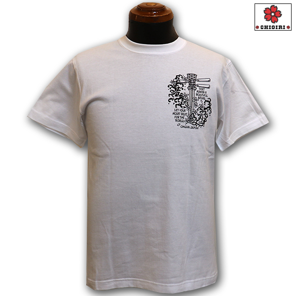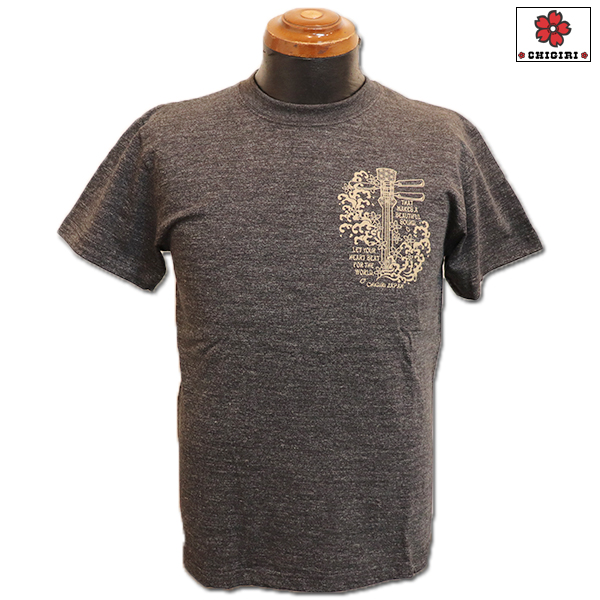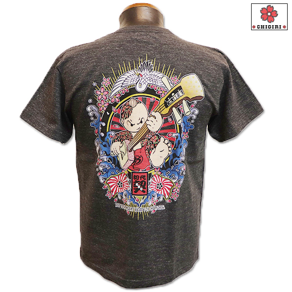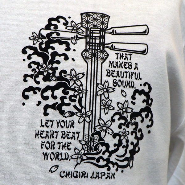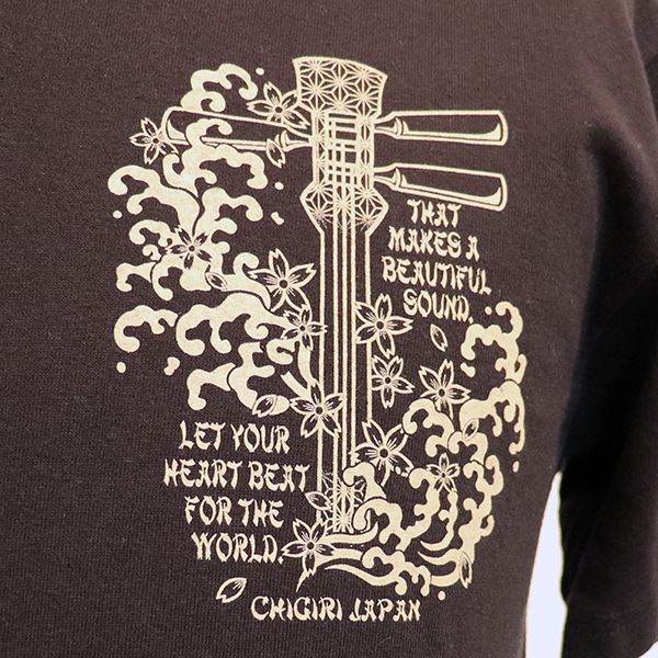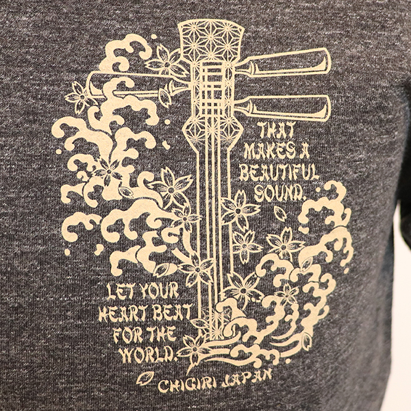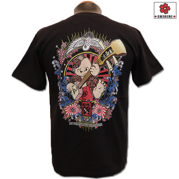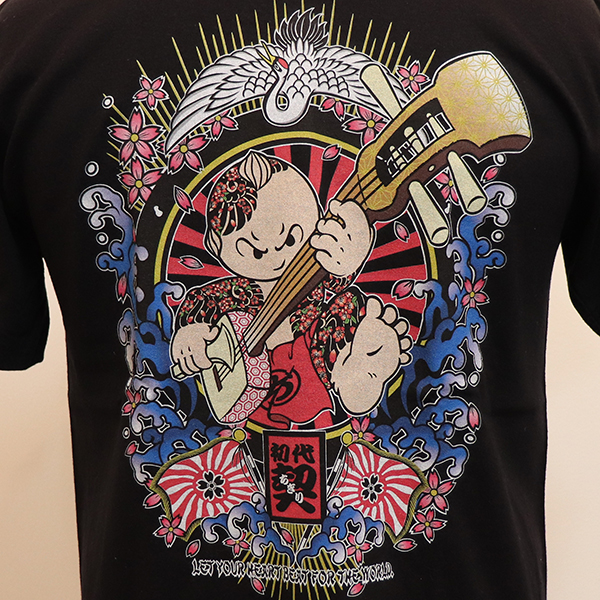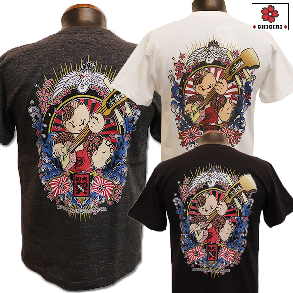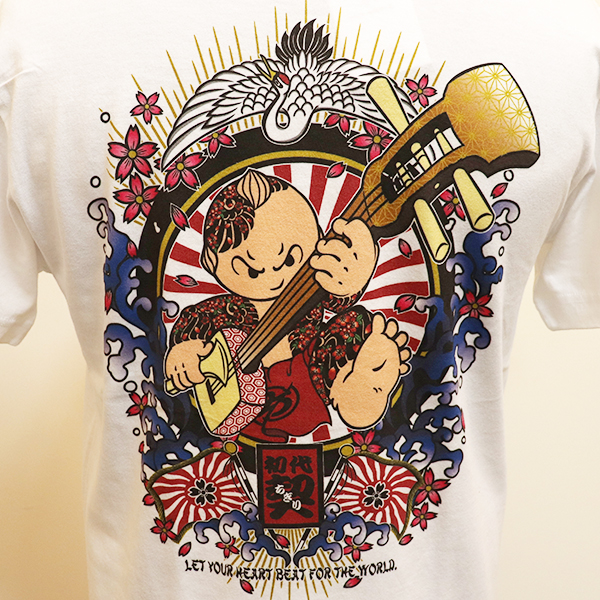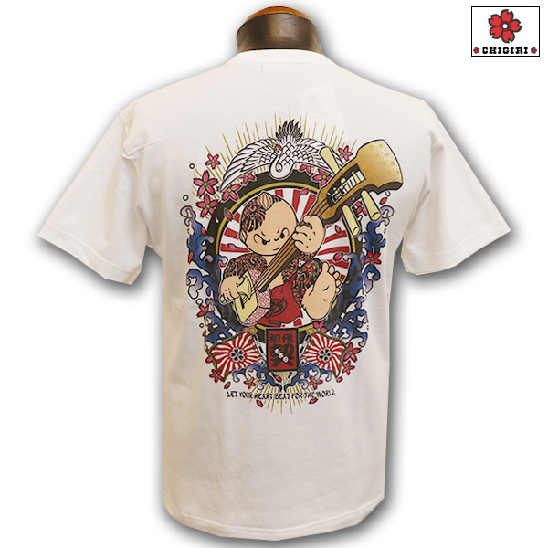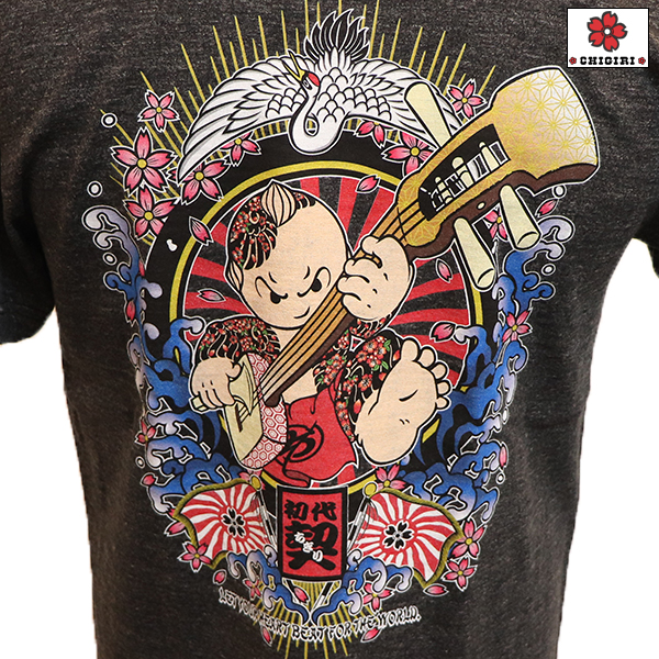 三味線をカッコよく弾くちぎりちゃんがバックにデザインされたTシャツ。ほかにも波、桜、ツルなど、和柄感満載の絵柄で、勢いのある一枚です。
