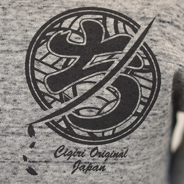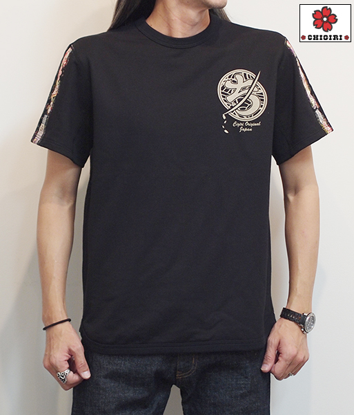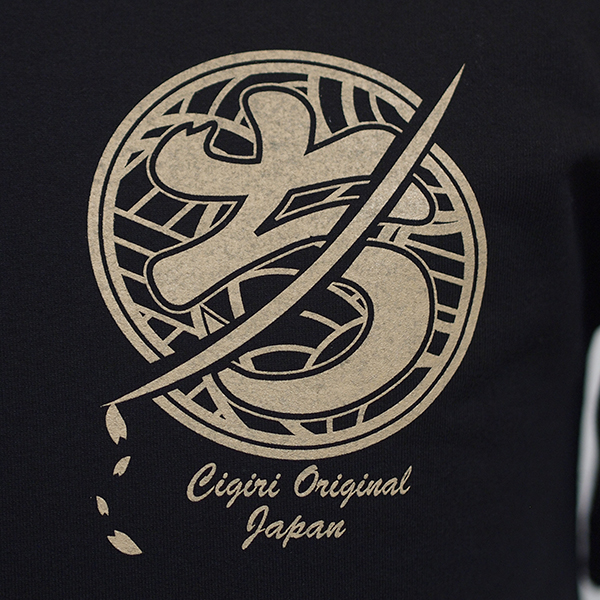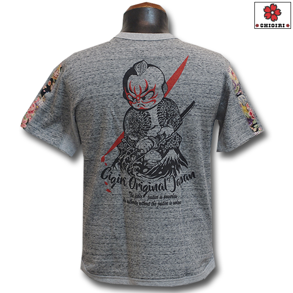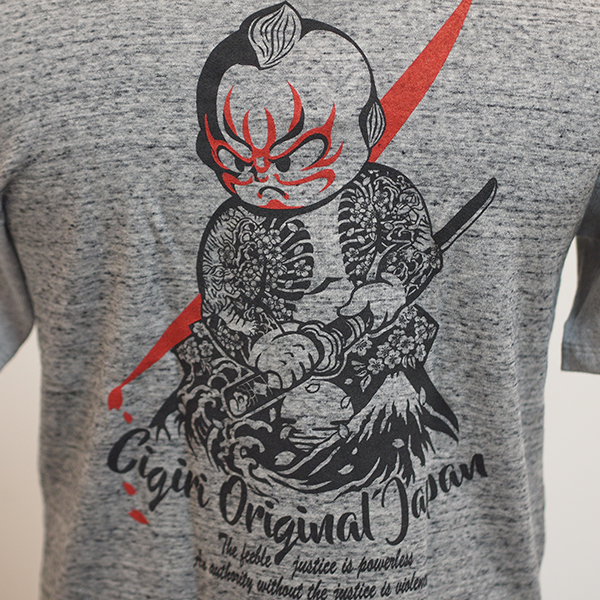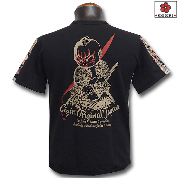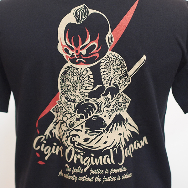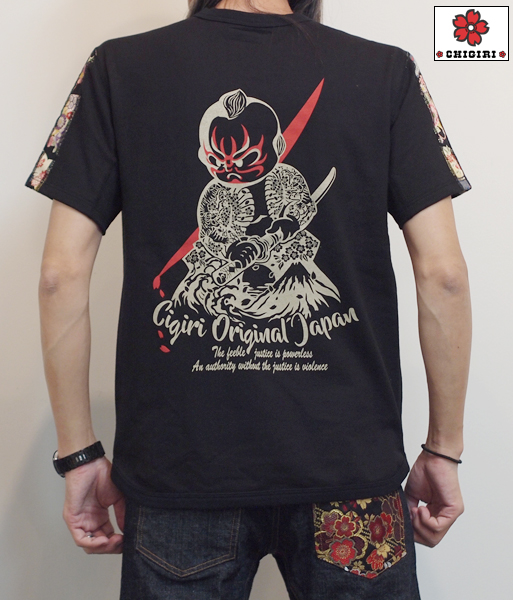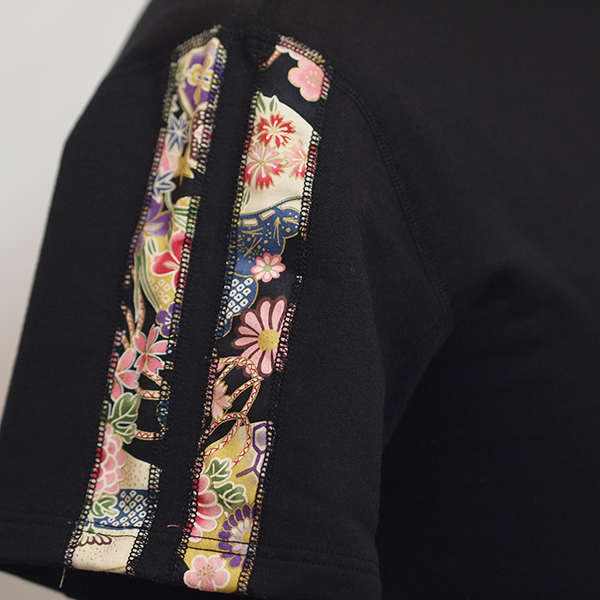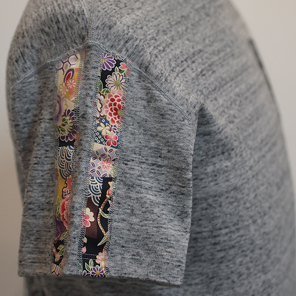 バックには歌舞伎ベイビーの新柄プリント。さらに袖には和柄生地で2本のラインを入れました。