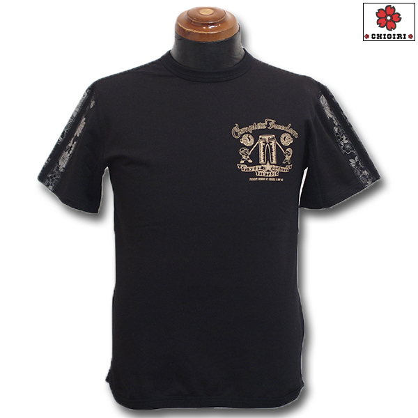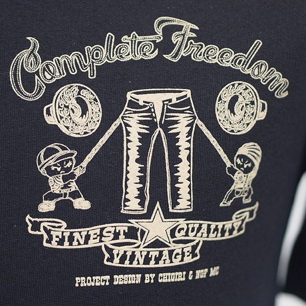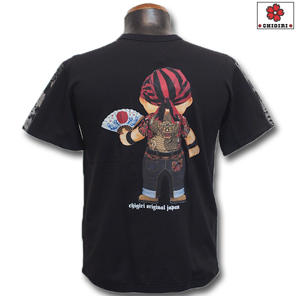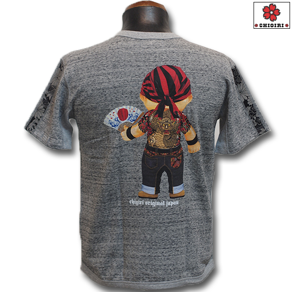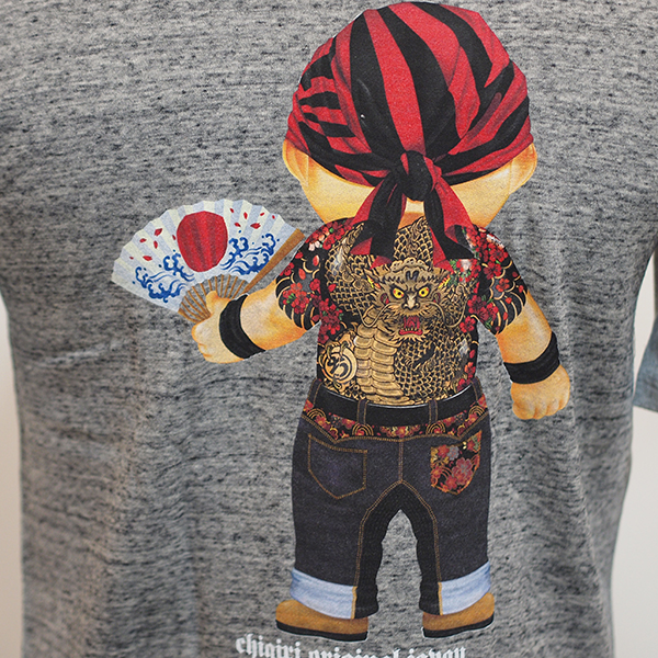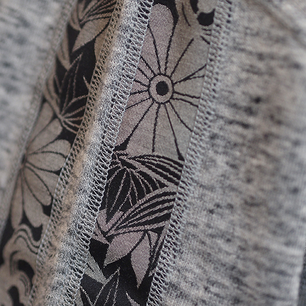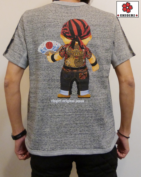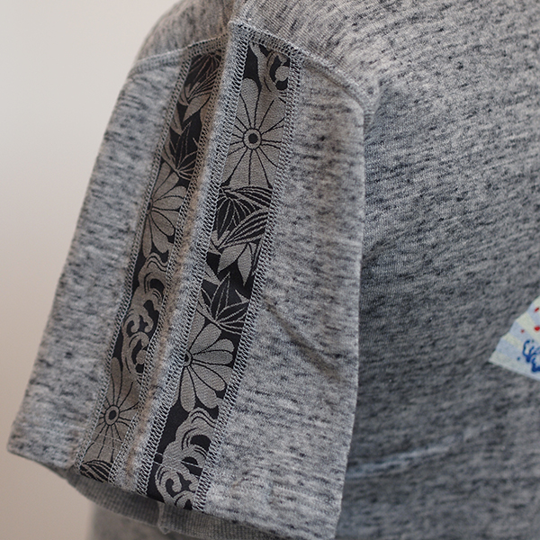 バックにはデニム扇ベイビーの新柄プリントをインクジェットで。さらに袖には和柄生地で2本のラインを入れました。