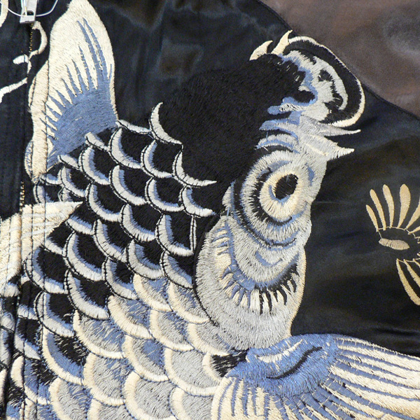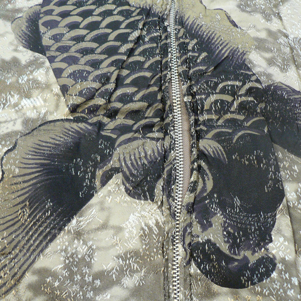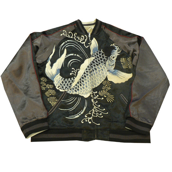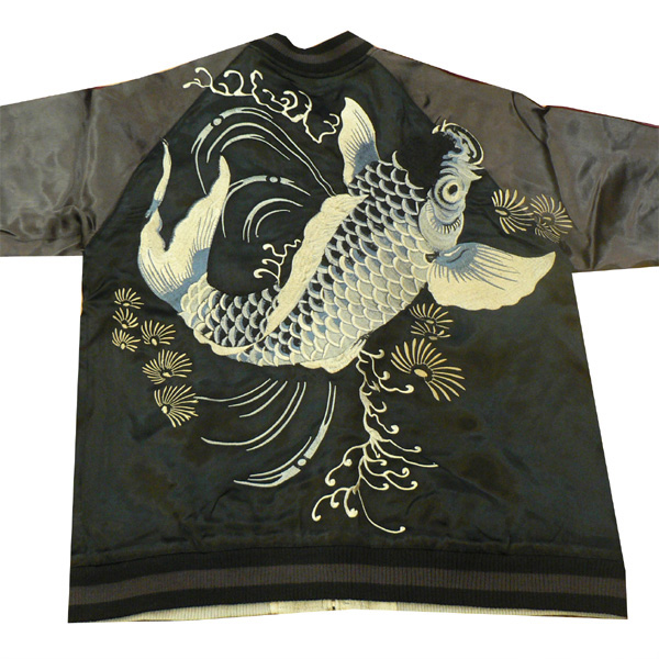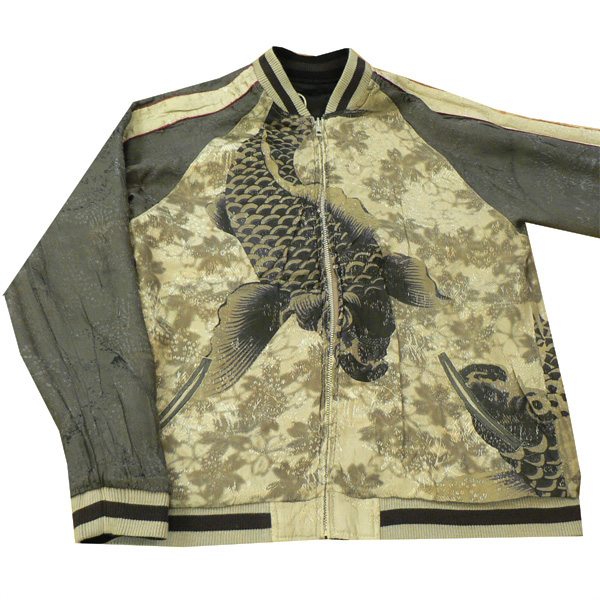 リバーシブルスカジャン。表面はサテン生地に一匹の勢いのある鯉が大胆に刺繍されています。袖はブラウンにブラックのラインで2トン。裏面はジャガード生地のボディに、鯉と桜のプリント。うっすらと陰影のある桜のプリントが雰囲気をだしてくれています。刺繍とプリントそれぞれの面白さを味わえます。