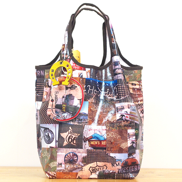 生地をランダムにプリントし、ビニール加工をしたユニークな生地。ツルツルとした表面が特徴的です。汚れが付きにくく、落としやすい生地でショッピングにぴったりなバックです。