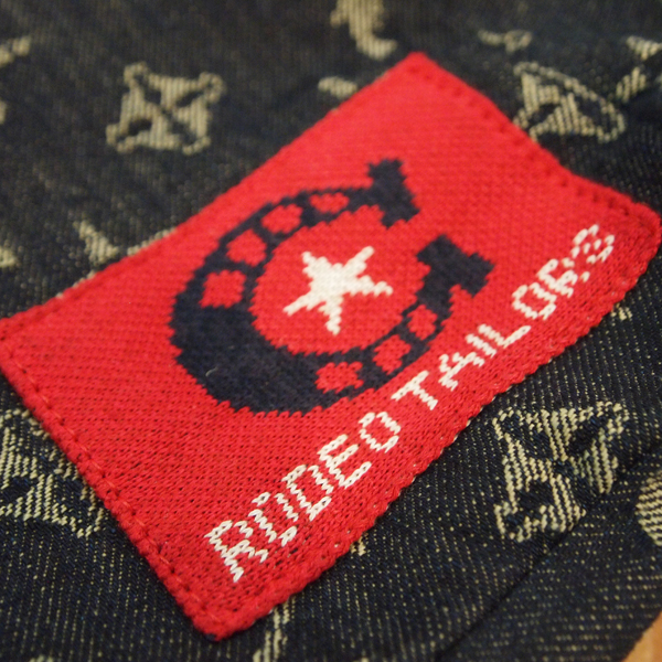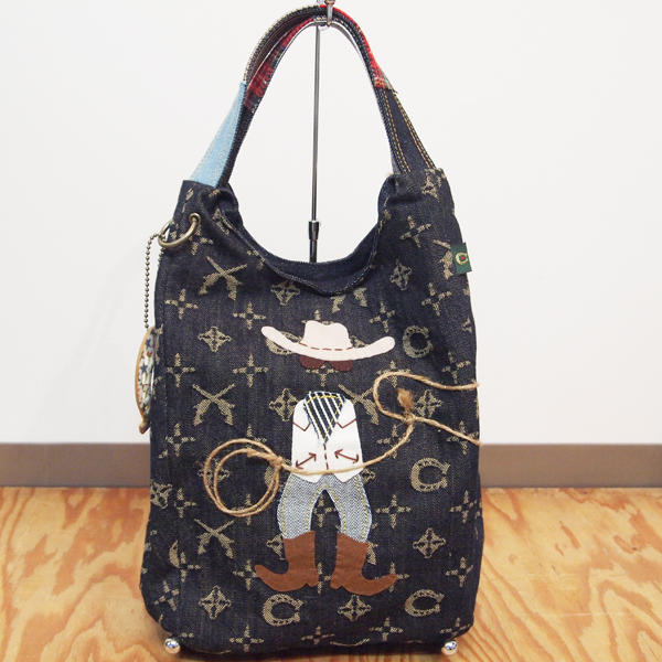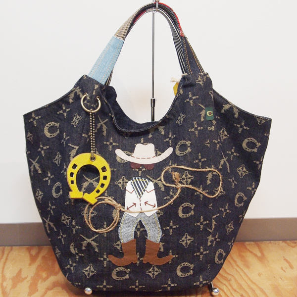 Sサイズのスイカトートバッグ。RODEO TAILORSで一番人気のモノグラムSuicaトートに、カウボーイのアップリケをハンド刺繍した新しいデザインです。