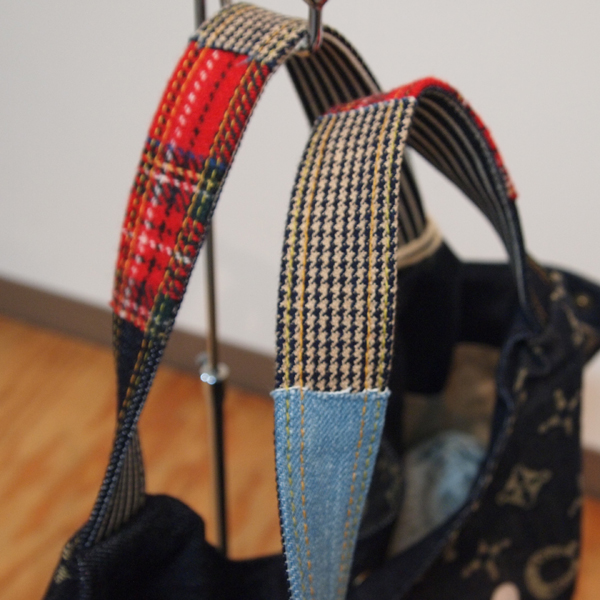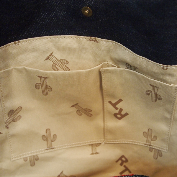 Bio.オーバーダイ生地使用 13ozモノグラムジャガードデニム 持ち手デニムパッチワーク レインボーファスナー ニットパッチ オリジナルサボテン柄リネン生地(裏地)