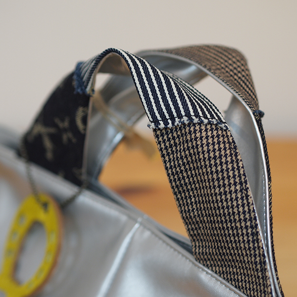 持ち手はモノグラムジャガードデニム、ヒッコリーなどのパッチワーク。