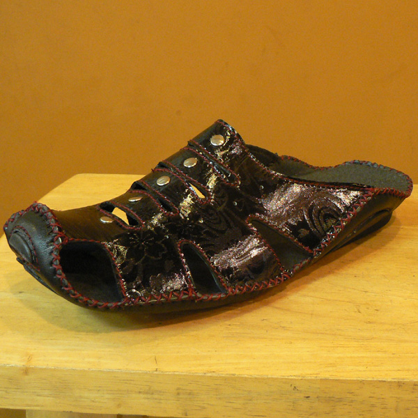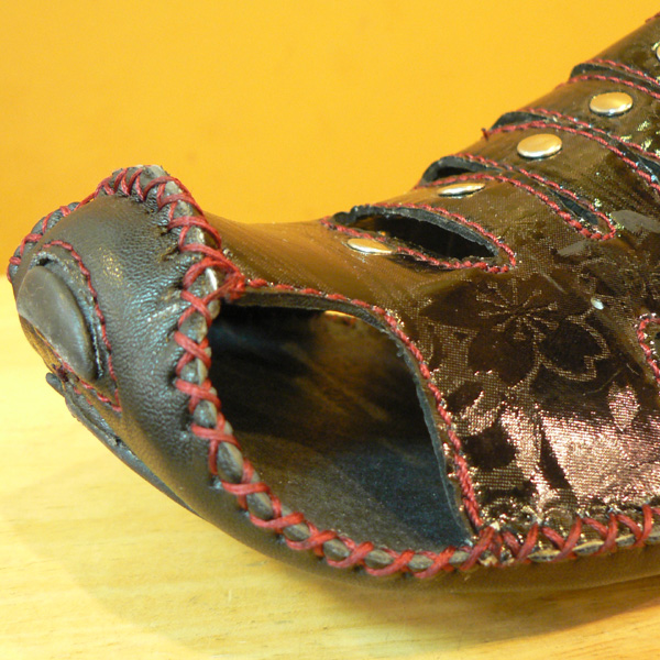 毎年人気のサンダル、今年も登場です。デザインもユニークで個性的なサンダル。つま先部分がロールアップされていますが履きやすいつくりになっています。ソールはゴムで滑らない様に、また疲れない様に工夫されています。ブラックのボディに、流水と桜がデザインされています。