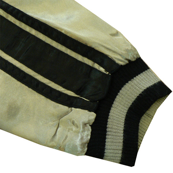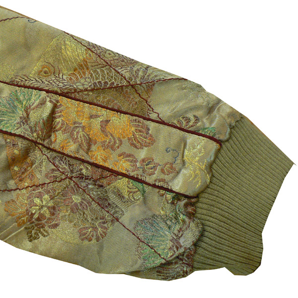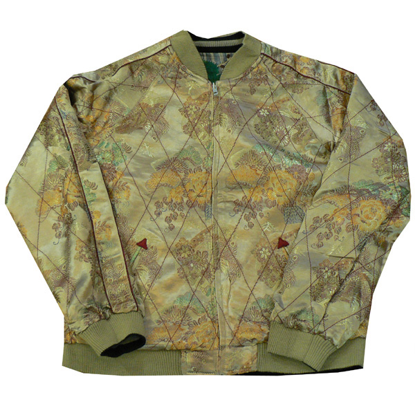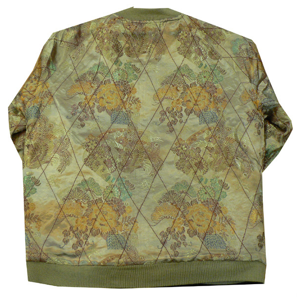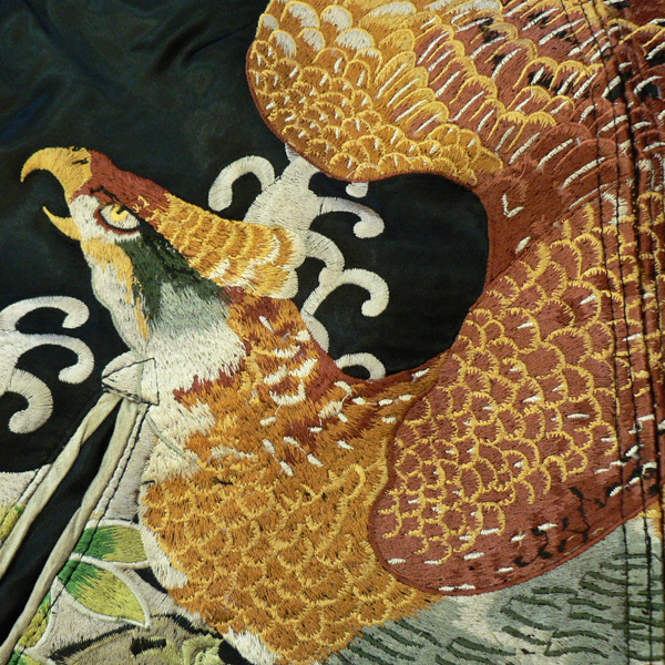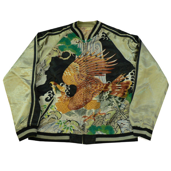 リバーシブル。表面は滝と鷹が大胆にデザインされ、刺繍されています。リバーシブル面は鳳凰などの柄のジャガード素材で、総柄になっています。表裏で全く違う2つの表情を持つスカジャンです。