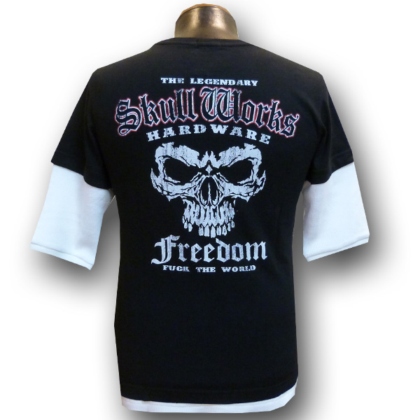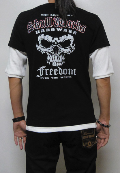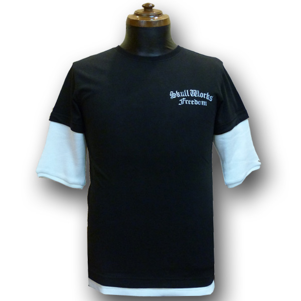 Tシャツの下に6分袖Tシャツを重ね着したようなデザイン。七分袖の素材はワッフル地。フロントはワンポイントプリント、バックにはスカルがデザインされています。