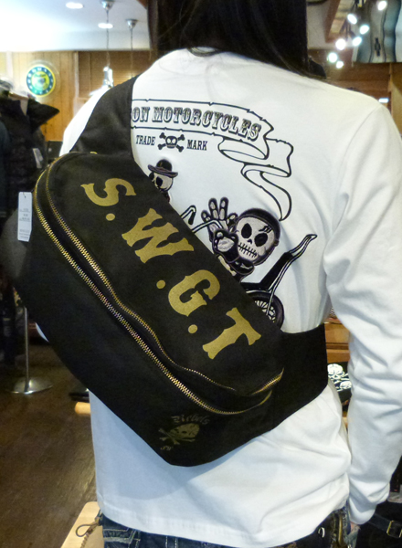 ロゴスカルボディバッグには「S.W.G.T」と書かれたロゴプリントのデザインとなっています。
