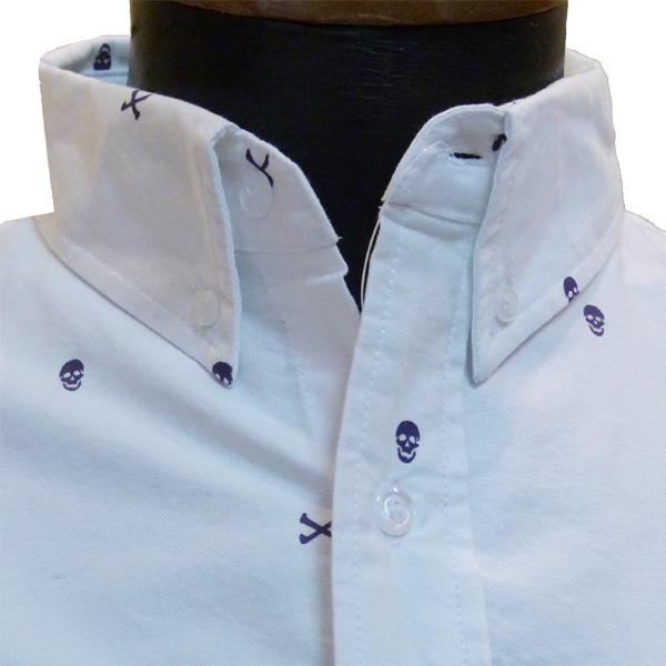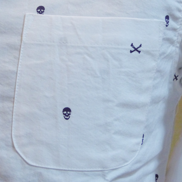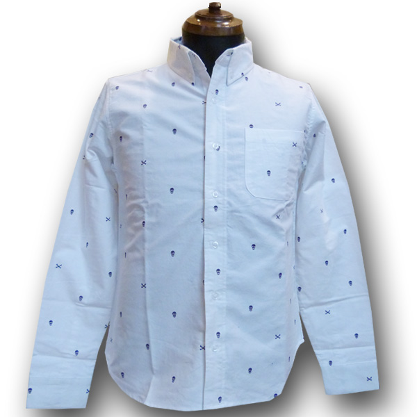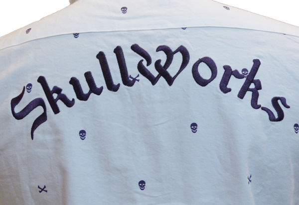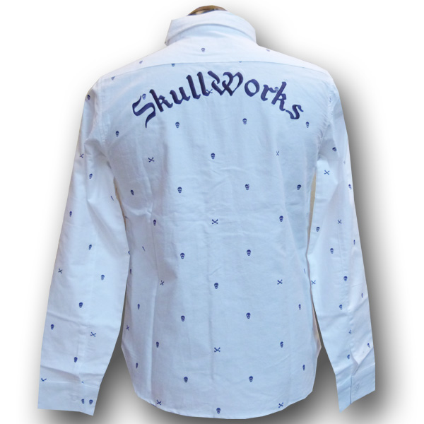 スカルとクロスボーンをドットに見立てたボタンダウンシャツ。バックには「Skull Works」の刺繍。色々な着こなしが楽しめるアイテムです。