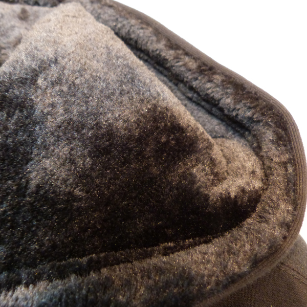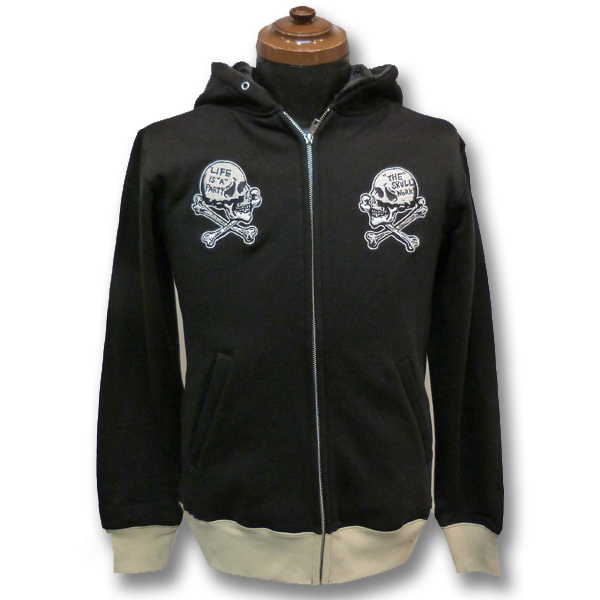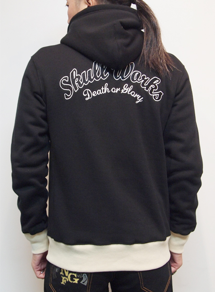 スカル柄のスウェットパーカー。フード内のボアがアクセントになっています。