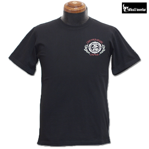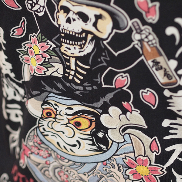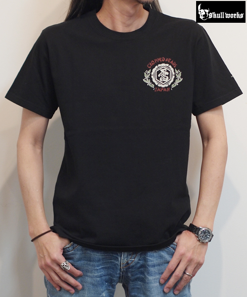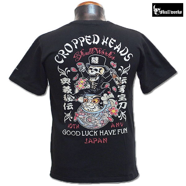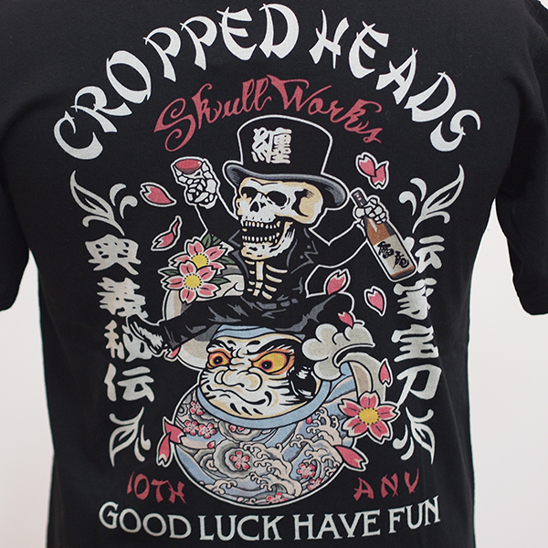 スカルワークス10周年を記念したクロップドヘッズとのコラボレーションTシャツ。ロウブロウスカルが刺青達磨に腰をかけたグラフィックは和洋折衷なデザイン。