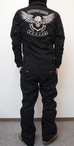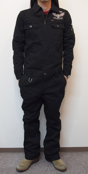 張り感のあるツイル素材のオールインワン。絵柄は刺繍になります。袖は、ジッパーで脱着可能、長袖から半袖に簡単に切替えられて便利!