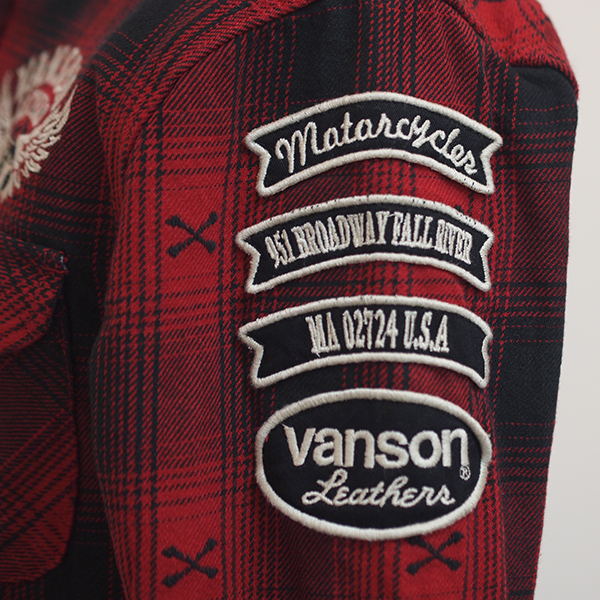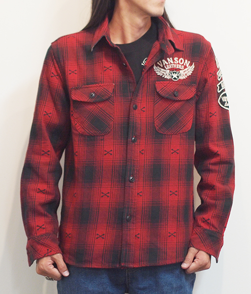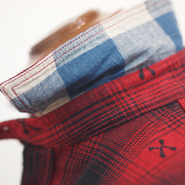 赤をベースとしたシャツが、アメカジの雰囲気をぐっと高めてくれています。