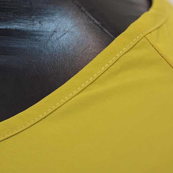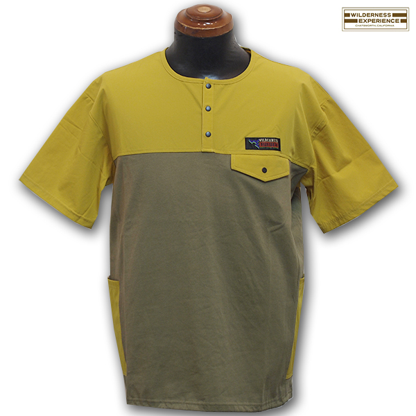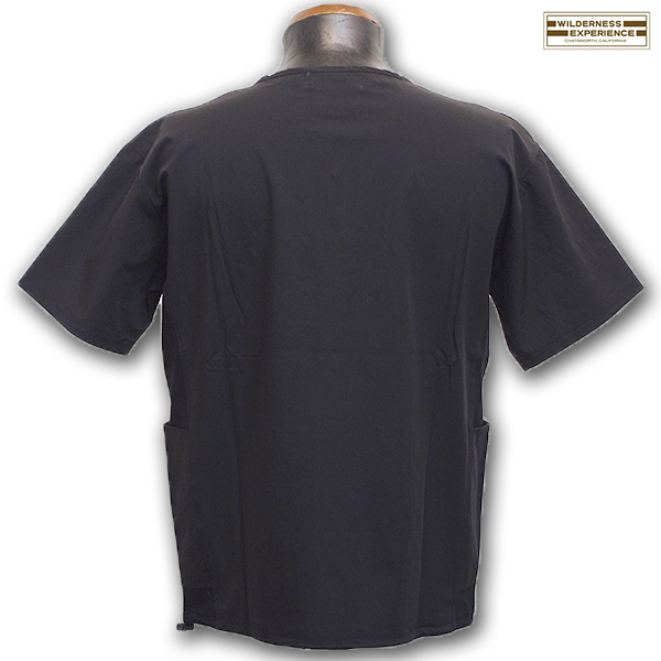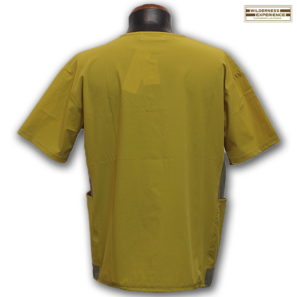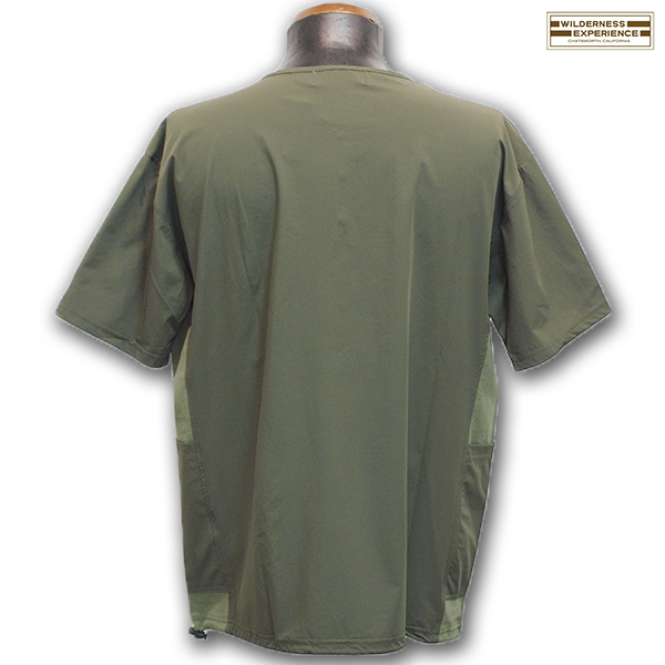 ストレッチのきいたポリエステル生地と天竺とで切替したTシャツ。