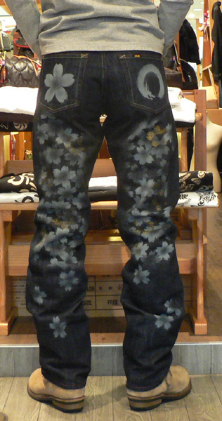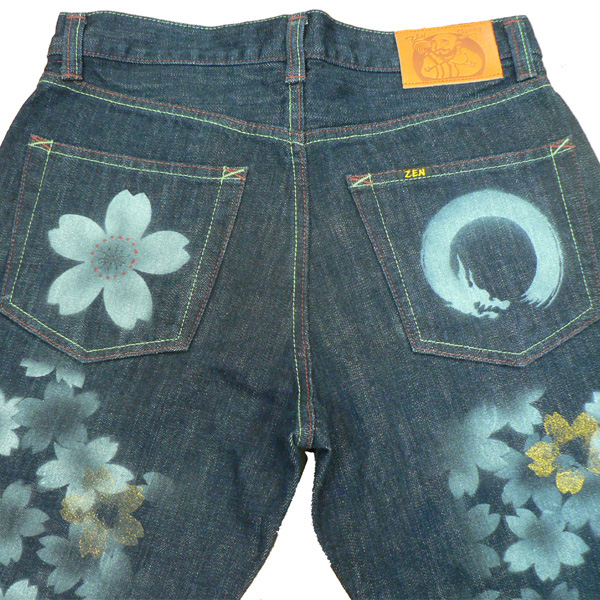 ボディーとなるジーンズは、デニムの名産、岡山倉敷市児島で制作したオリジナルジーンズに、京都の職人が一本づつ柄を手で描いた作品です。一本ずつ手描きのため、それぞれが世に一本しかないデニムとなります。 |